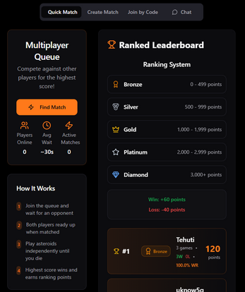 Miss the old days of arcade machines and high-score? If so we got you covered. Biteroids is an online Asteroids arcade machine! But, it is not regular Asteroids. We have added new power-ups to gameplay, a matchmaking systems that finds you a competitive match fast! Add the best players to you friend list and challenge them personally. GET MOVING PILOT!